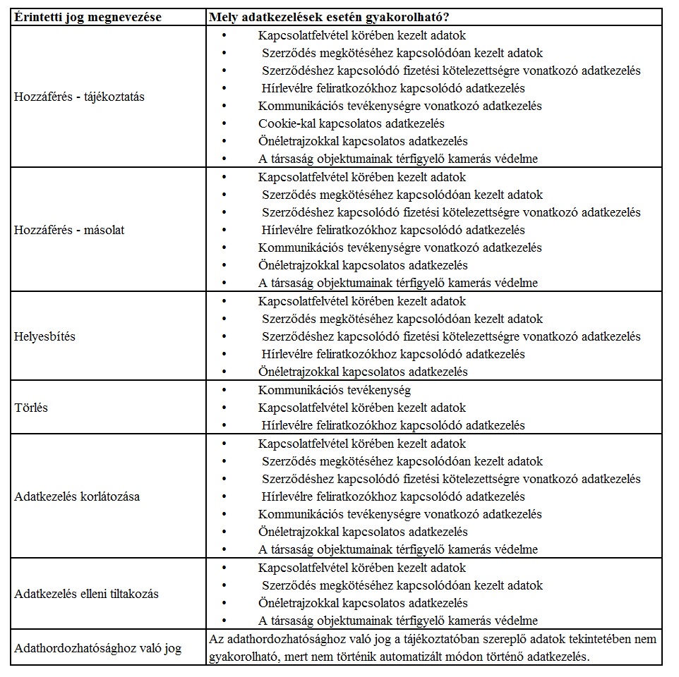 A jogok az érintett megfelelő azonosítását lehetővé tevő kérelem társaság részére történő eljuttatásával gyakorolhatóak. Amennyiben kérdése merül fel, kérjük, forduljon hozzánk bizalommal az alábbi elérhetőségeink egyikén: 2030 Érd, Kis-Duna utca 9.,